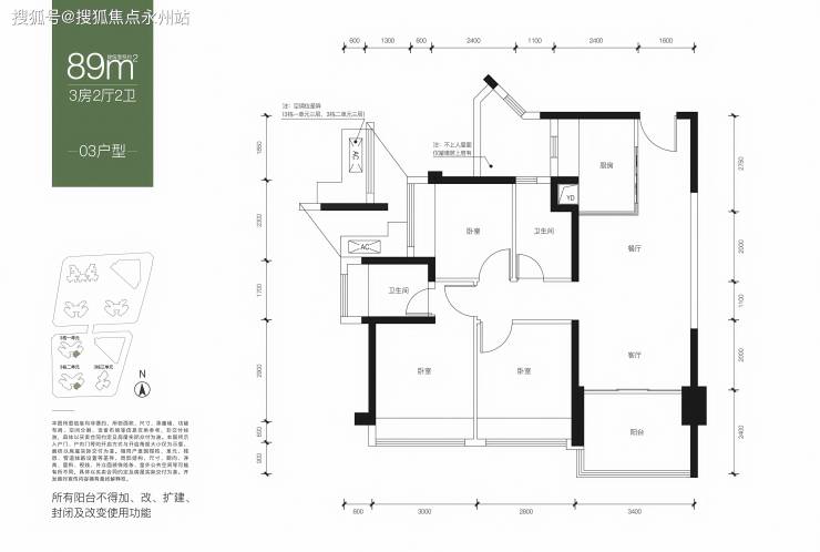 89㎡的3房2厅2卫户型设计的是经典竖厅格局,客厅3.4米开间,三开间朝南,3个卧室分别是3米/2.8米/2.4米的宽度,L型厨房,