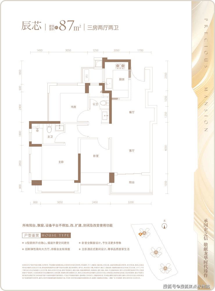 87㎡三房两卫:竖厅格局,LDKB 一体化设计,餐客厅一体通透,3.2米开间,满足家庭社交需求;双卫设计解决早高峰洗漱冲突,全南户型兼顾实用与舒适。