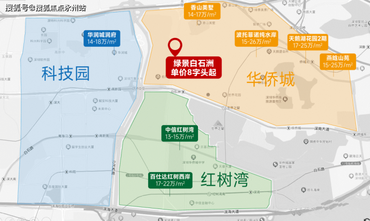 项目位于南山侨城区域,环绕着深圳湾超级总部基地、后海总部基地、蛇口前海自贸区、福田CBD等核心区域,这个片区随着高端产业不断落地,片区持续爆火,以至于华润城住宅高峰时卖出了近20+万的价格,本次开卖的是,紧挨华润城住宅项目的又一高端新盘住宅巨作—绿景白石洲璟庭!