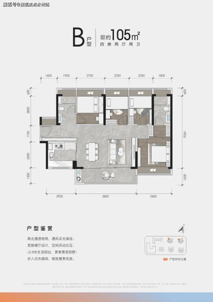 105㎡的南北通透横厅四房两厅两卫,带5.8米超大景观生活两用阳台,全屋采光、透气效果绝佳,主卧还配置了步入式的衣帽间,对于二孩家庭来说,是非常高性价比的一步到位选择。