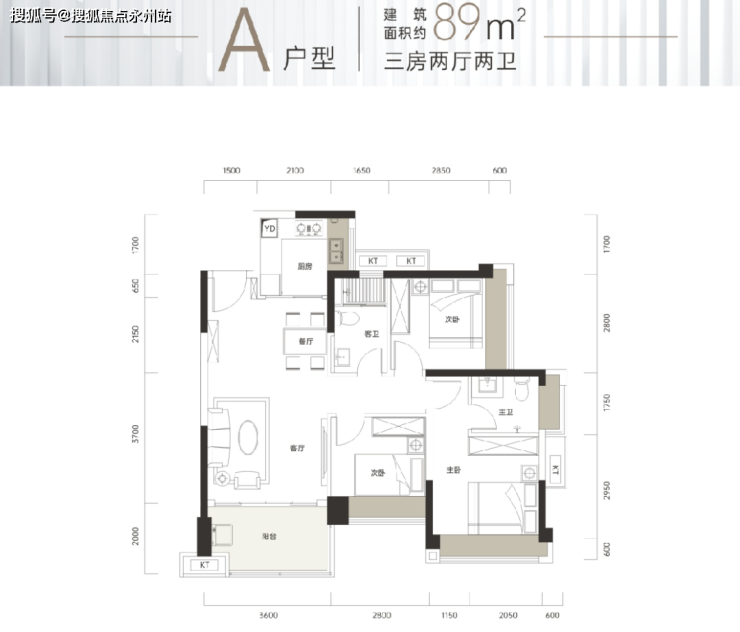 建面约89平的3房,很常见的厅出阳台、竖厅设计