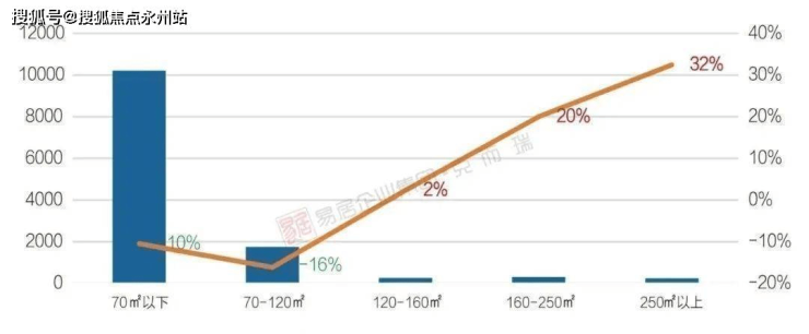 图表显示,相较2020年,160㎡以上的大面积户型公寓成交则呈上涨趋势,如160-250㎡上升20%,250㎡以上的公寓成交更是上涨32%。