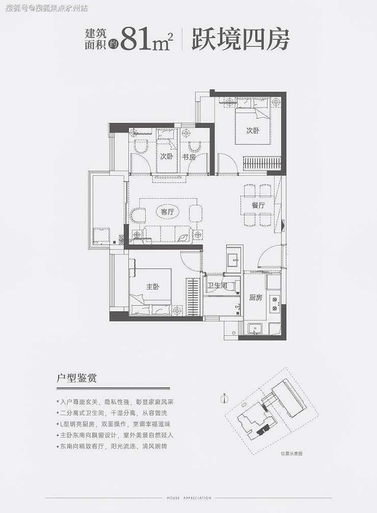 81㎡四房一卫:双龙抱珠格局,三开间朝南,动静分区;最小房间可改书房或储物间,东南朝向阳台,得房率75.19%。