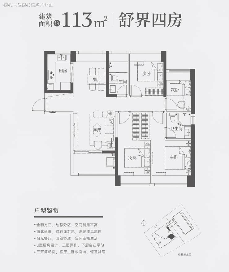 104㎡三房两卫:竖厅南北通透,U型厨房(操作台面4.5米),主卧带270°飘窗,东南朝向阳台,得房率75.19%。