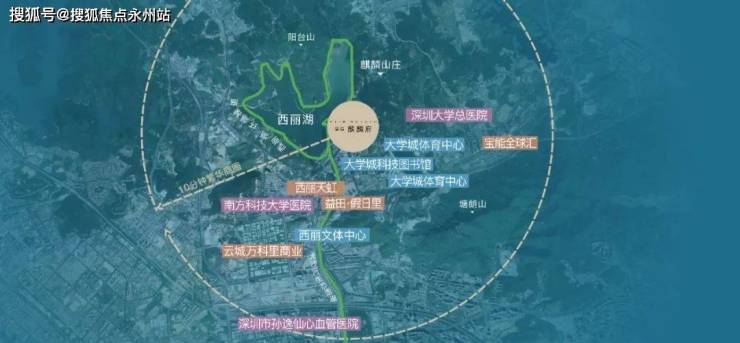 生态方面:项目位于西丽度假村,旅游休闲资源丰富,主打生态景观。高层西北侧可眺望西丽湖,东南侧被深圳野生动物园(有消息称动物园原址规划为高校用地,或搬去坪山)和西丽高尔夫俱乐部环抱,远看塘朗山公园。周边有西丽大学城,高校林立,人文气息浓厚。