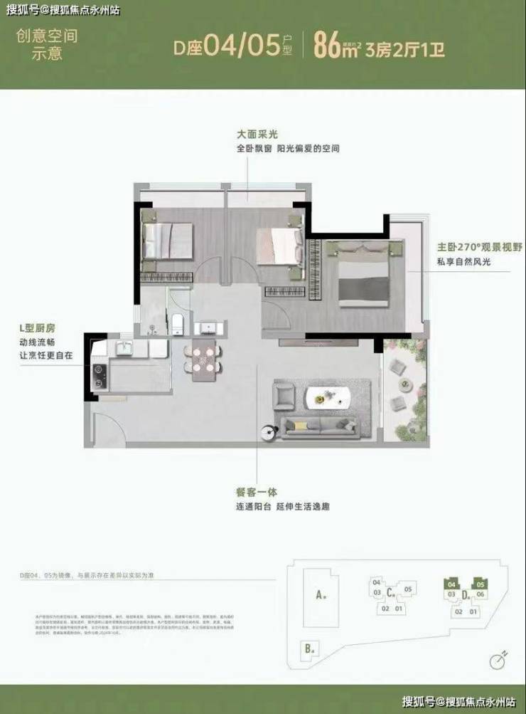 【86㎡3房2厅1卫】大面采光,全卧飘窗 阳光偏爱的空间 L型厨房,动线流畅让烹饪更自在 餐客一体,连通阳台 延伸生活逸趣 主卧270°观景视野,私享自然风光
