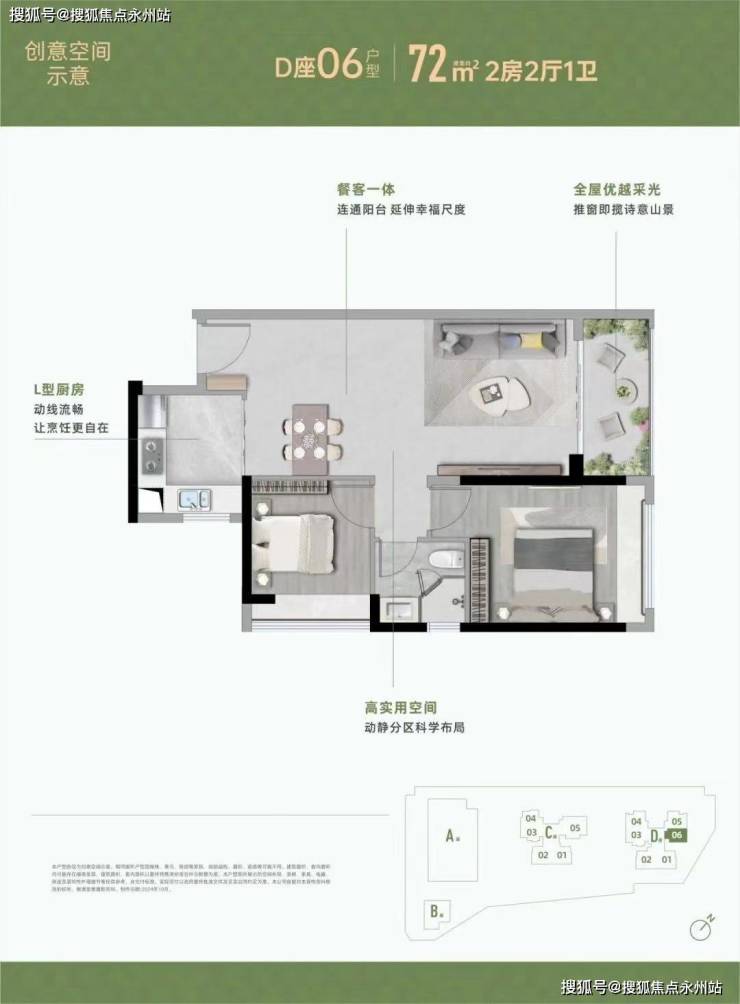 【72㎡2房2厅1卫】高实用空间,动静分区科学布局 全屋优越采光,推窗即揽诗意山景 餐客一体,连通阳台 延伸幸福尺度 L型厨房,动线流畅让烹饪更自在