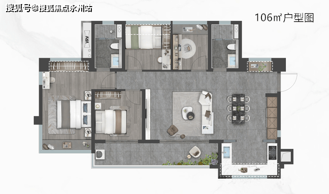 【御景:106㎡的4房2厅2卫】横厅南北通透格局,客餐厅开间5.6米,餐厨一体化,约13.7米超幕视野,超长阳台,主卧转角270°大飘窗,只有2栋07户型才有,得房率:78.99%(不含赠送),阳台主朝西南向。