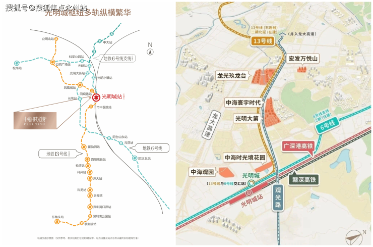 在交通方面,项目距离光明高铁站仅300-500米,通勤至深圳各区及广州、香港等地便捷无比。同时,项目距离在建的13号线同观路站也仅300-600米,7站直达南山,连接高新区、深圳湾等核心区域。此外,项目周边还有多条地铁线路规划,如地铁6号线南沿支线和18号线(规划中),未来交通将更加便捷。