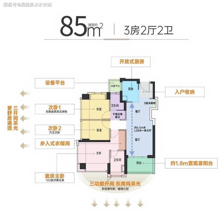 客厅带深进深阳台,主卧180度景观窗带最新80厘米进深飘窗,还带了舒适独立卫生间,并可装大排衣柜,85平做到这个主卧效果,点赞!双客卧均带最新版进深飘窗。