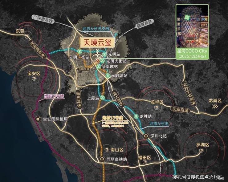 交通方面,光明中心区已形成“三横两纵”城市道路骨架,地铁6号线、6号线支线均设有站点,可快速联动湾区都市生活圈,2026年将推动地铁13号线二期(北延)建成通车,这条串联南山与光明的“科创线”,将进一步加速人才与创新资源的流动,大幅提升区域通勤效率。