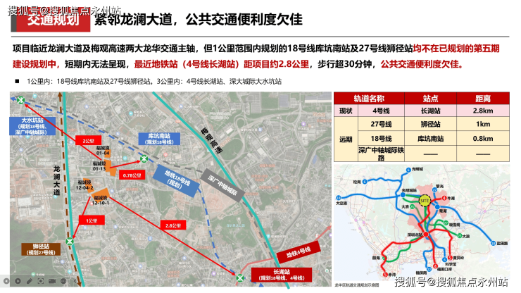 项目区域内主次干路体系完善,交通便捷。片区交通规划优异,规划打造“4线2路”的交通体系,1公里范围内拥享18号线库坑南站及27号线狮径站,临近梅观高速及龙澜大道两大龙华交通主轴,30分钟可达深圳北站及福田CBD核心区,不过当前最近的4号线“长湖站”距离约2.8公里,步行超30分钟以上。