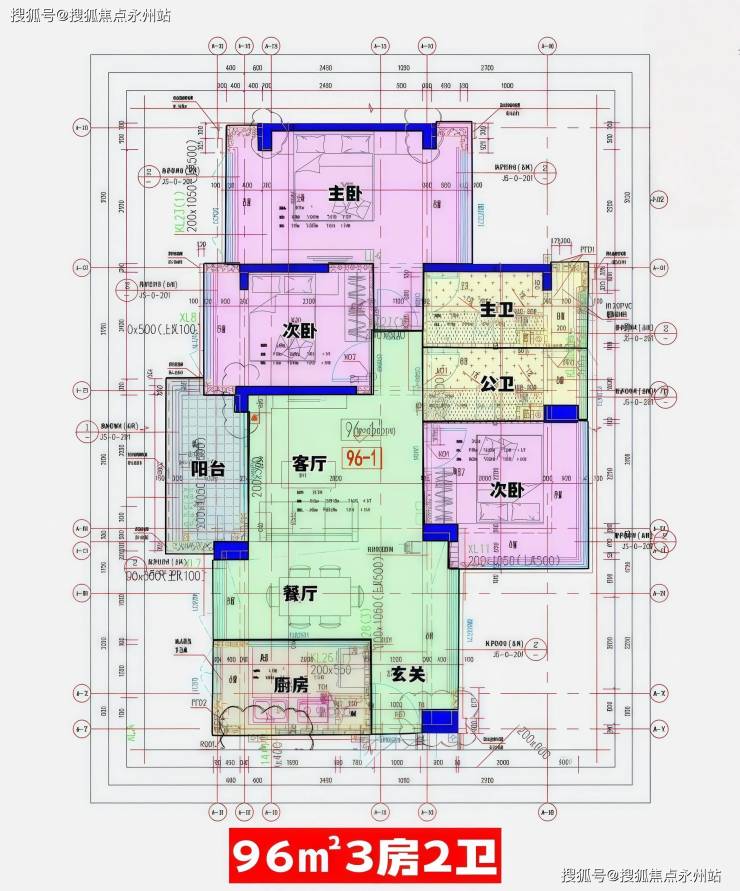 96㎡的3房2厅2卫(-1),设计的是经典竖厅格局,进门入户玄关,客厅3.7米开间,LDKB一体化,S墙设计预留冰箱卡槽位,动静分区,三开间朝南,3个卧室分别做到了主卧14.13㎡/次卧9.91㎡/次卧9.45㎡(去掉墙体,包含飘窗),U型厨房,公卫三段式分离,还带1个设备平台,东南朝向。