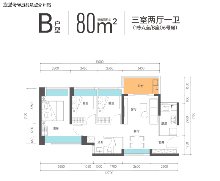 约80㎡3房,相比于市面同面积多一房的同时,餐客厅双向采光设计,对流通风佳,主卧也是做到了南北通透,双飘窗对流!