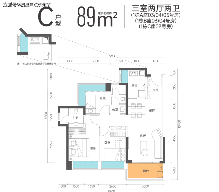 约89㎡3房2卫。经典实用格局,比市面同功能的三房面积更小,总价更低。同时三开间朝南,居住舒适度有保障。