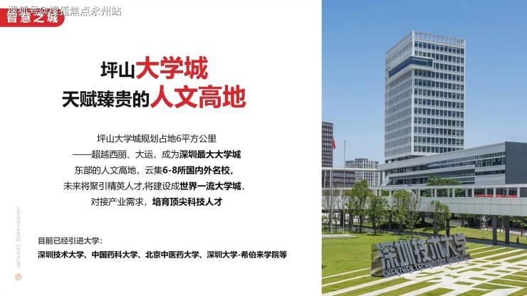 坪山大学城,目前引进了深圳技术大学、深圳北京中医药大学研究院,规划引进中国药科大学、深圳大学希伯来学院等6-8所高校,助力坪山创新人才培养及产学研一体发展。