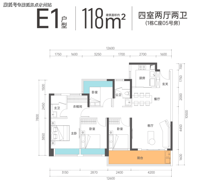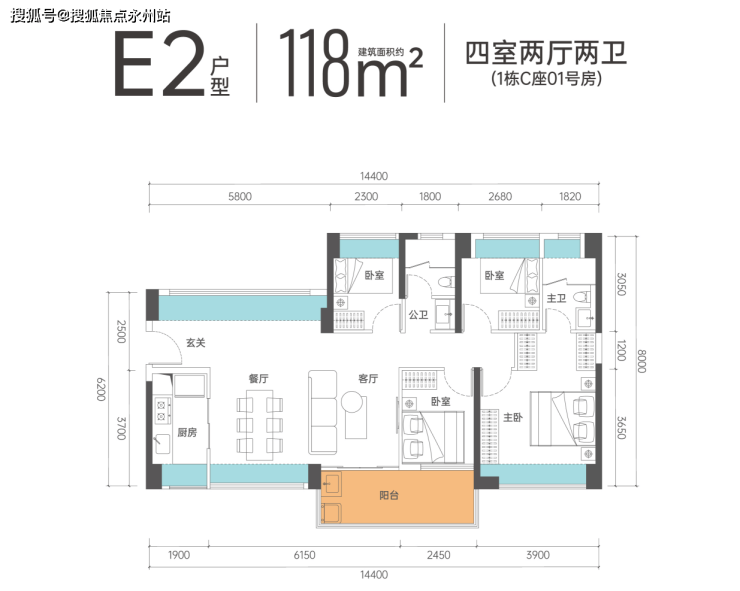 约118㎡阔绰4房2卫,两种户型均带尺度超阔绰的宽景阳台,满足进阶生活更高享受。