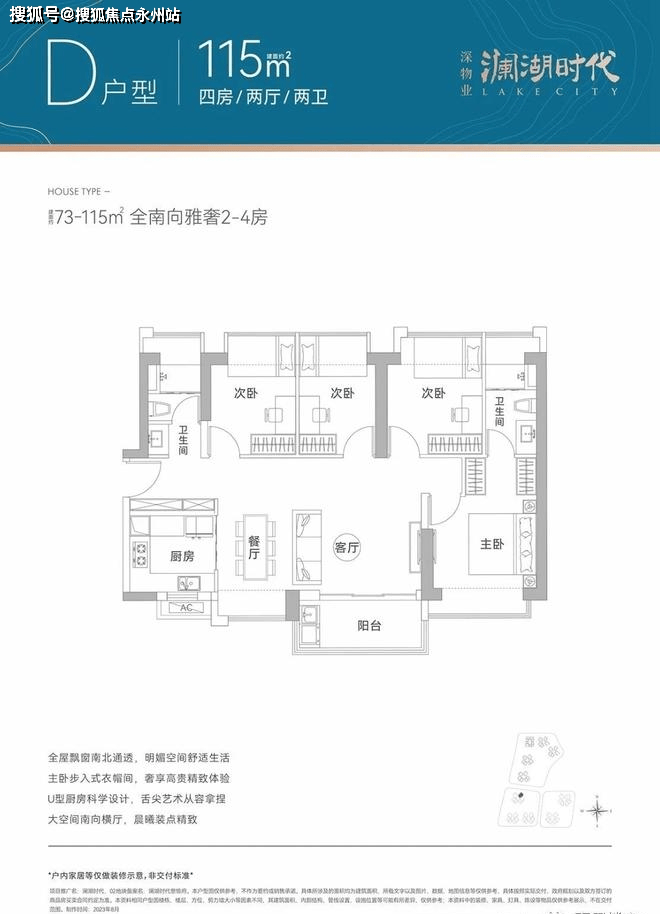 115㎡的4房2厅2卫,设计的横厅南北通透格局,全屋飘窗,U型厨房。
