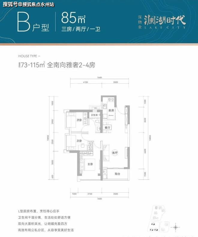 85㎡的3房2厅1卫,设计的竖厅格局,L型厨房,有西南及东南朝向。