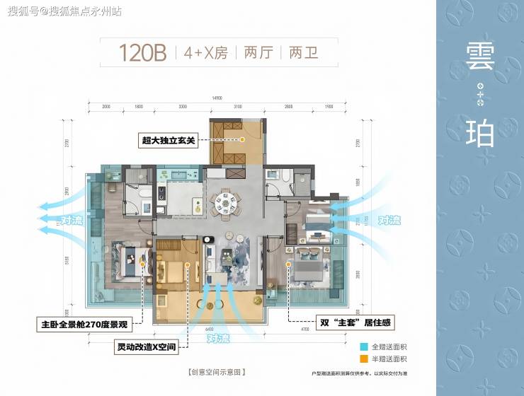 亮点设计:双赠送空间,两个北向阳台可改造为卧室或书房,实际使用面积达约160㎡,相当于传统143㎡户型的空间感。