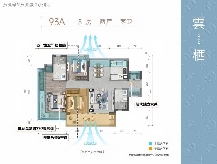 93㎡户型:A 户型实用面积 103㎡,赠送 27.3㎡;B 户型实用面积 98.5㎡,赠送 25.8㎡。