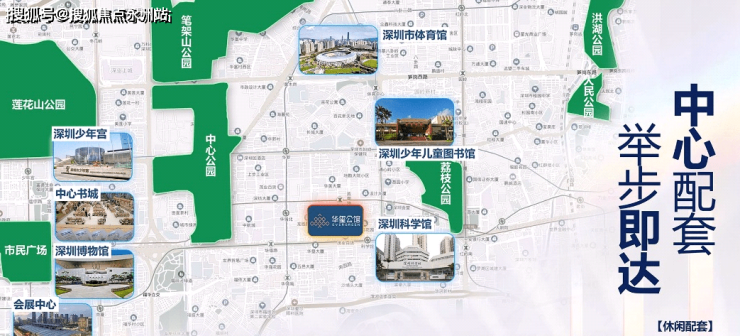 休闲配套:荔枝公园,中心公园、笔架山公园、莲花山公园、福田河景观带·文体配套:深圳市体育馆,科学馆、少年宫、音乐厅、关山月美术馆、深圳博物馆、中心书城