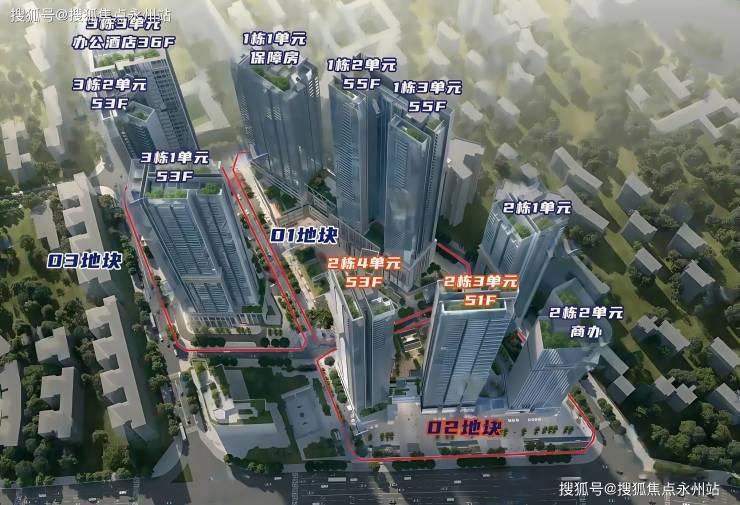 规划为4栋超高层塔楼,2栋一单元住宅174米53层,2栋二单元办公130米27层,2栋三单元住宅168米51层,2栋4单元住宅175米53层。