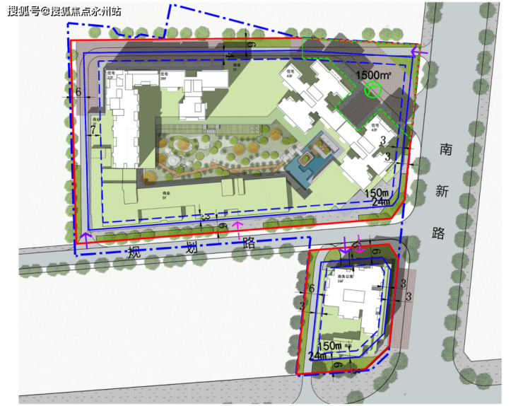 项目整体分为南北两个区域。南区是商业地块,拟建一栋33层商务公寓和2层商业裙楼,并设置地下室三层。其中商务公寓的地上计容积率总建面约为1.6万㎡,商业部分约2100平方米。
