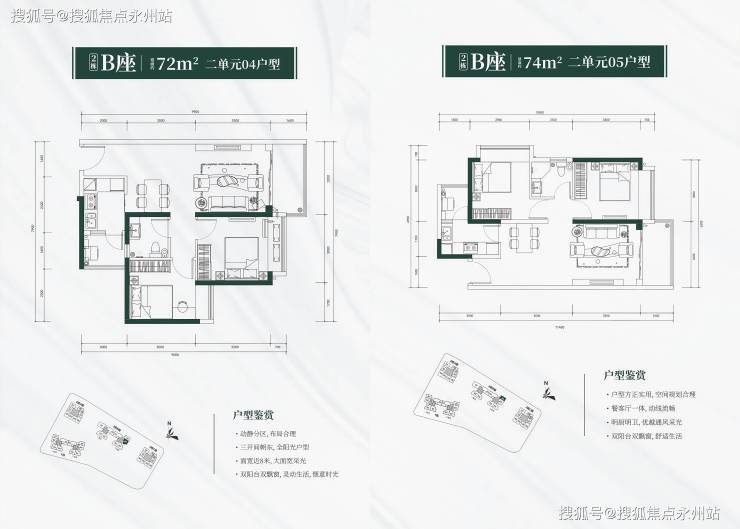 2栋B座二单元04/05户型:72-74㎡两房两厅一卫(东南/东向),共99套,占比约42.1%,为福田核心区罕见小户型。