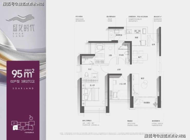 95㎡的3房2厅2卫,1栋C座01户型,设计的是经典竖厅格局,客厅3.35米开间,进门入户玄关,餐客厅一体化,主卧套间设计,L型厨房带1个生活阳台,卫生间干湿分离,得房率:约78%(不含赠送),阳台东北朝向。