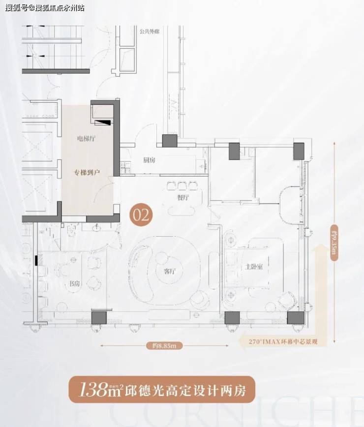 天宸138㎡户型,四梯四户,专梯入户,整个框架可以灵活打造,大面积没有承重墙和承重柱,可以随心设计自己的家。电梯厅加厨房,外部连廊加半个阳台算赠送面积,所以空间利用还算挺高。