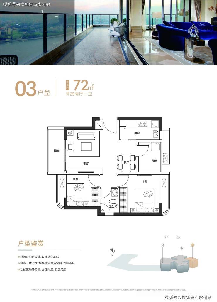 核心特点:东南朝向为主,南北通透全明格局,入户玄关设计提升私密性。99㎡户型配备约6.2米全景阳台,可同时容纳休闲与晾晒功能。