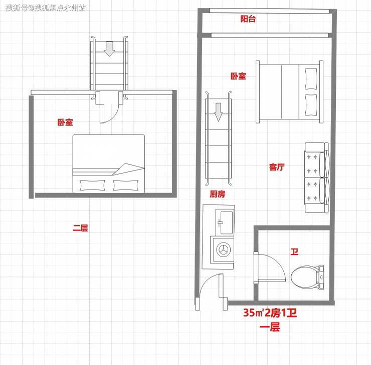 建面约 35㎡两居室:层高3.6米,采用“双厅+双卧”设计,通过定制化柜体实现超强收纳功能,如入户玄关柜、卧室榻榻米收纳床等,实际使用率显著提升。