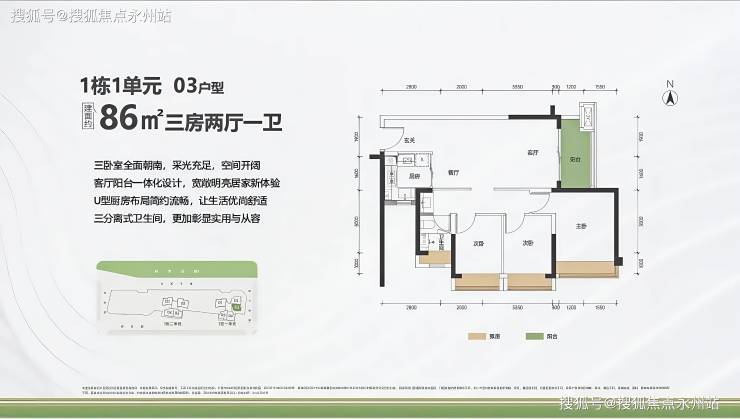86㎡三房两厅一卫(横厅设计):采用横厅设计,客餐厅一体化面宽达 5.2 米,连通约 6 米景观阳台,采光与视野俱佳618。主卧与次卧分列两侧,形成动静分区,减少干扰。