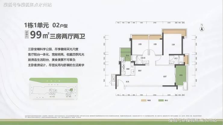 面积细分:99㎡与102㎡均为三房两卫,其中102㎡分布在1栋2 单元中高楼层,客厅开间更大(约4.2米),且部分房源可实现南北通透。
