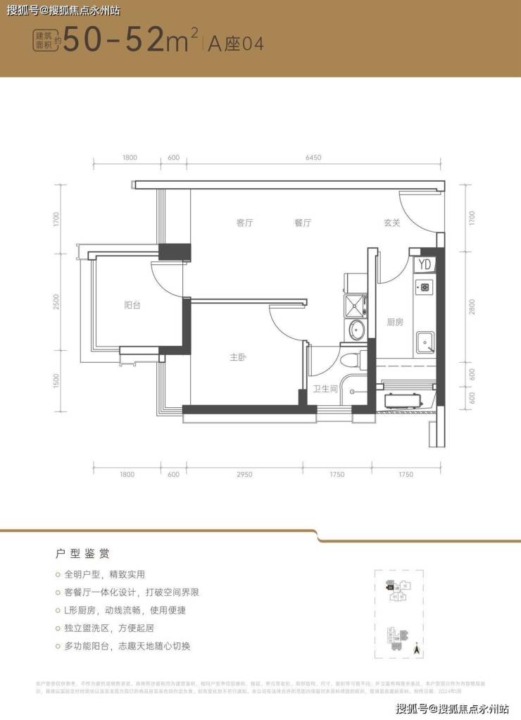 【建面约50-52㎡上车小户】:做得是竖厅格局,空间十分紧凑,无过道零空间浪费,L型厨房带一个生活阳台,餐客厅一体化设计,客厅开间约3米,全明户型,客厅带飘窗,卫生间做的三段分离式的,更加合理利用空间,阳台可以根据需要改造成一个小房间(样板间有展示)