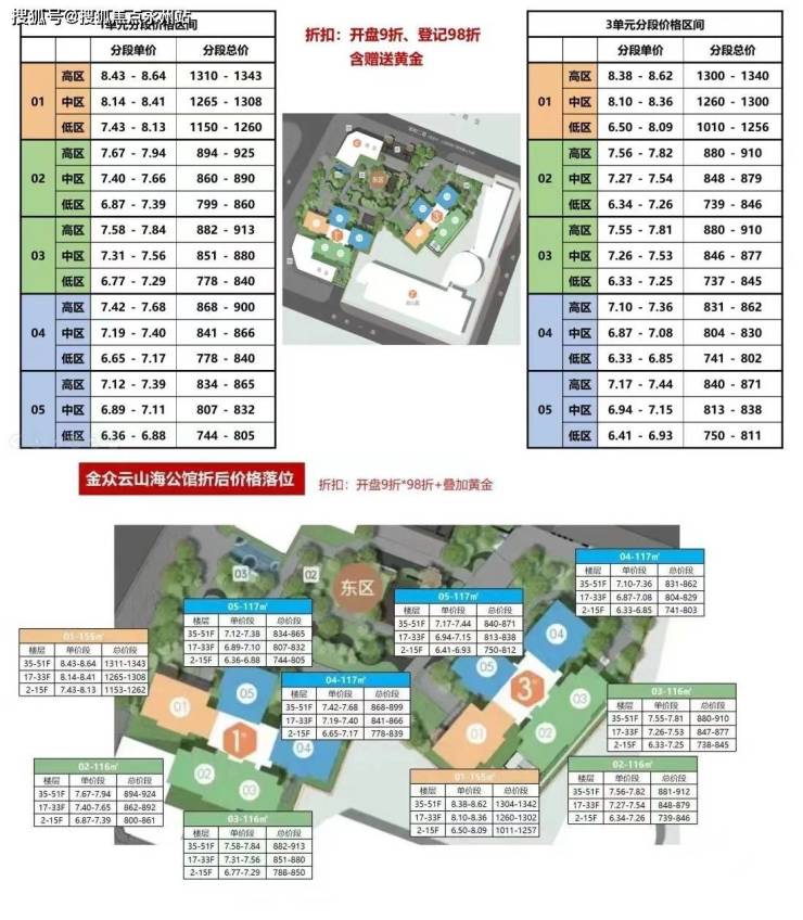 「金众云山海公馆(东区)」给出了9折*98折*98折*98.5折的优惠,综合下来相当于是8.51折,折后均价7.2万/㎡,折后单价6.09-8.31万/㎡,总价在710-1293万/套,并且认购前88名客户,还可以赠送50克黄金(仅限本人领取,价值约27500元)