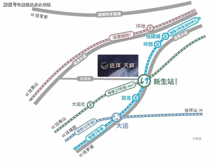 远洋天祺苑,由远洋集团开发,位于龙岗区坪地街道坪西社区龙坪路与坪西路交汇处,项目所处位置属于坪地国际低碳城范围内,近年来该片区一座座楼盘拔地而起,改出片区新面貌,造就新生活。项目西侧规划1所九年制27班学校, 3号地铁东延线”新生站“距离约800米。