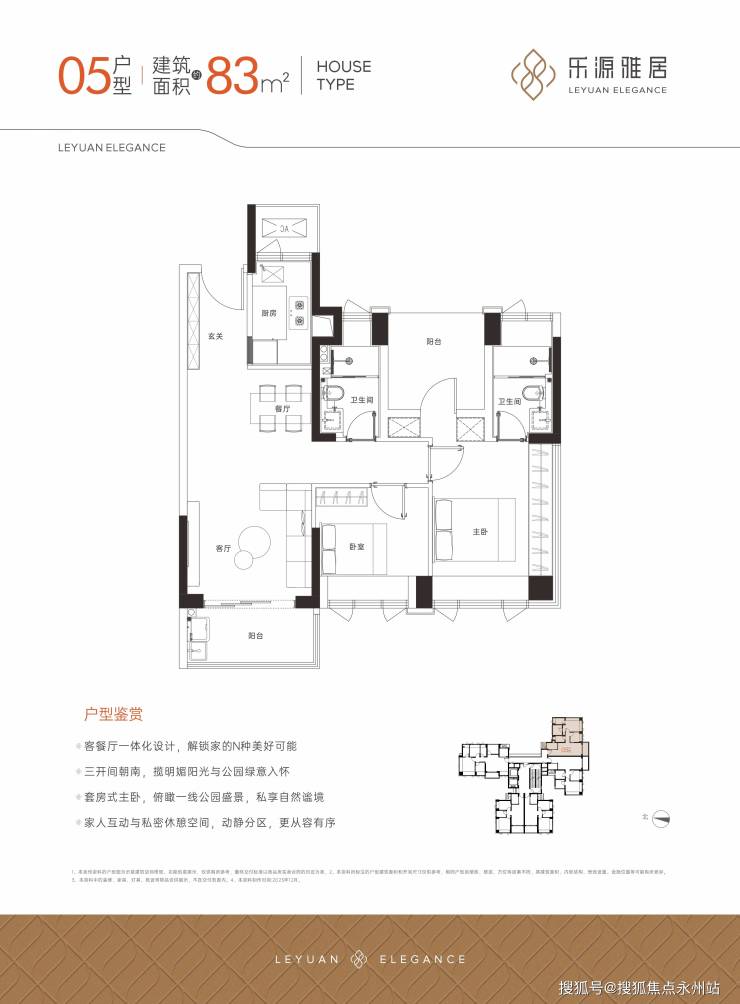 83㎡的3房2厅2卫,设计的是竖厅格局,LDKB一体化,动静分区,三开间朝南,U型厨房,卫生间干湿分离,得房率约94%(包含赠送),东南朝向。