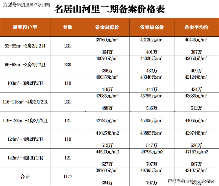 建面为约94㎡的两房到142㎡的四房户型,建面分了16个面积段,备案均价为3.88万-4.31万,备案总价也从364万-483万不等。