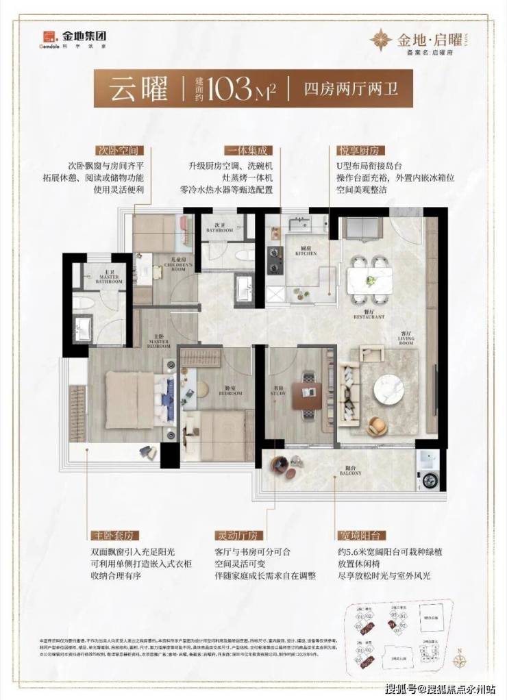 ●约103㎡竖厅动静分区四房两卫,LDKB一体化设计,动静分区,四开间朝南,主卧270°转角飘窗,U型厨房,公卫三段式干湿分离,得房率约90%(包含赠送),客厅连接餐厅出5.6米长的大阳台,西南或东南朝向。