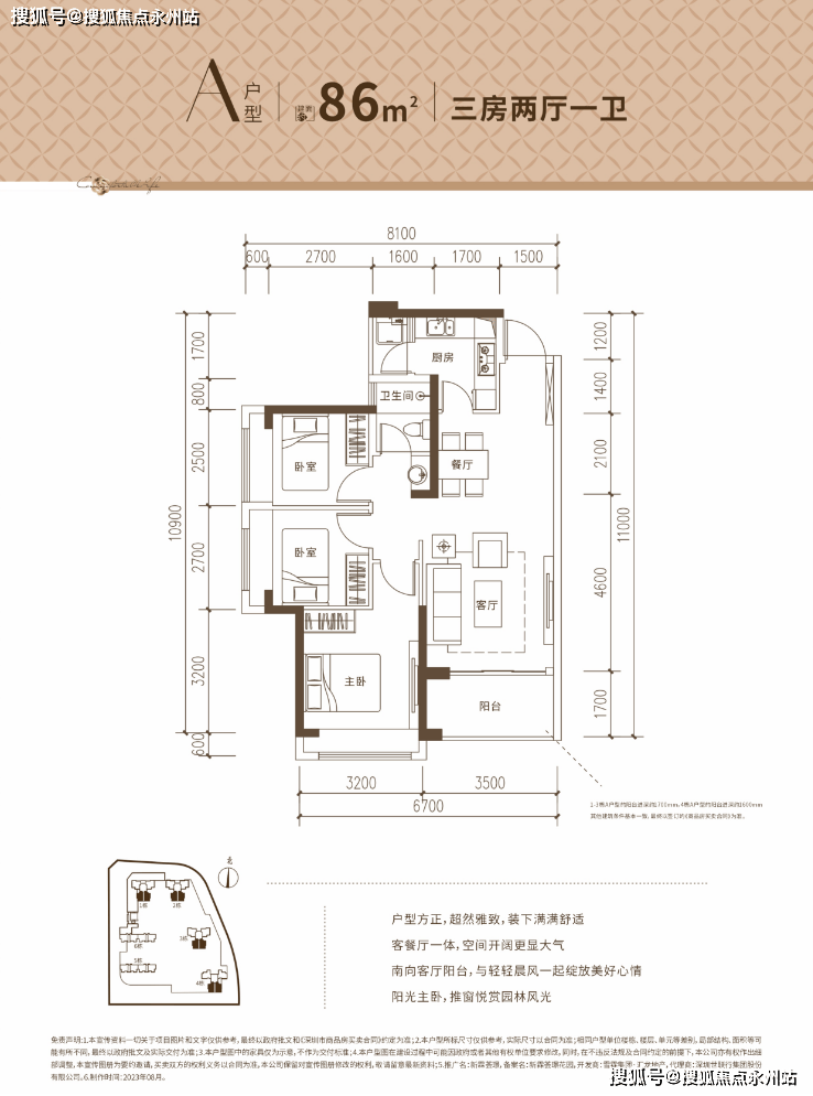 86㎡的3房2厅1卫,设计的竖厅格局,客厅3.5米开间,L型厨房,卫生间三段式分离,正南朝向。