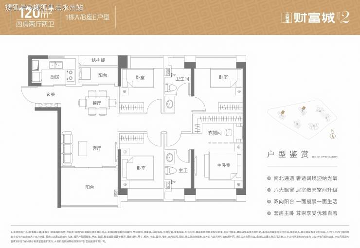 120㎡四房两厅两卫:南北通透竖厅,双阳台 + 四开间朝南设计。