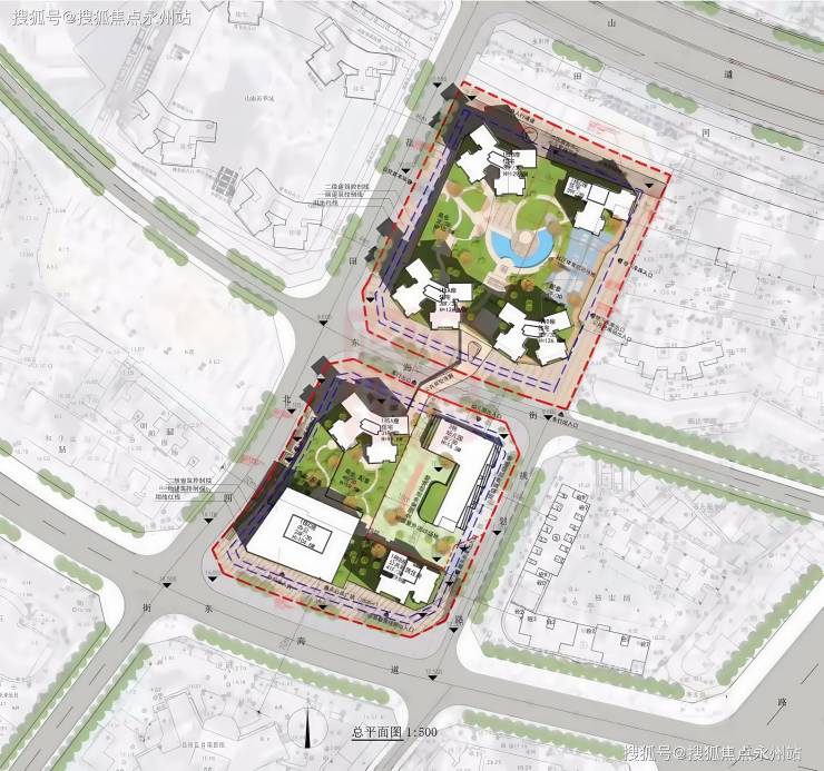 项目分为南北两区,规划有4栋38-39层高层住宅、1栋28层办公写字楼、1栋41层保障房,以及1座12班幼儿园,南北区通过廊桥相连。建筑采用大围合式布局,营造出开阔的中央水景空间,泳池位于中心位置,整体风格为国际流行的现代简约风,实现人车分流、商住分离。