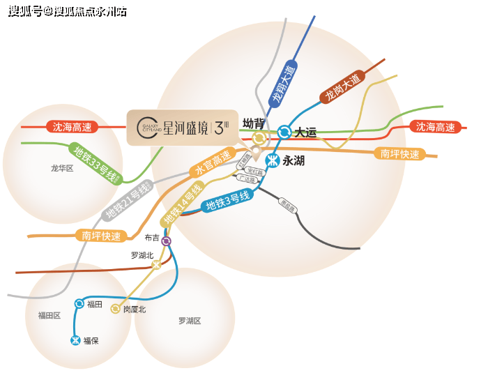 在交通方面,星河盛境3期地理位置优越,距离地铁3号线永湖站约500米,邻近14号线坳背站。入伙后,项目会为业主提供免费巴士搭乘服务,轻松抵达坳背站,可实现1站到大运,5站罗湖,6站福田。建设中的深大城际与14号线在坳背站交汇,7站可达机场东。另一条深惠城际快线规划时速160公里,将实现6站南山的快速通勤。
