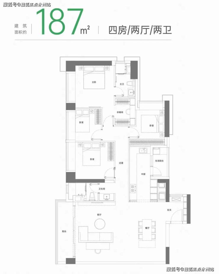 110平三房两厅两卫:入门级三房户型,经典竖厅设计,动静分明、保障隐私。