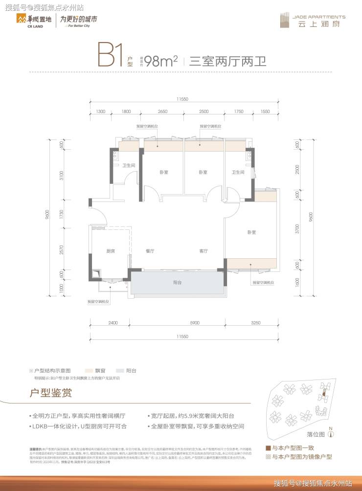 98㎡的3房2厅2卫,B1户型,设计的是横厅南北通透格局,客餐厅5.9米开间,LDKB一体化,3个卧室分别做到了3.25米/2.65米/2.5米的宽度,U型厨房,公卫三段式分离设计,得房率81.23%(不含赠送),阳台主朝东南向。