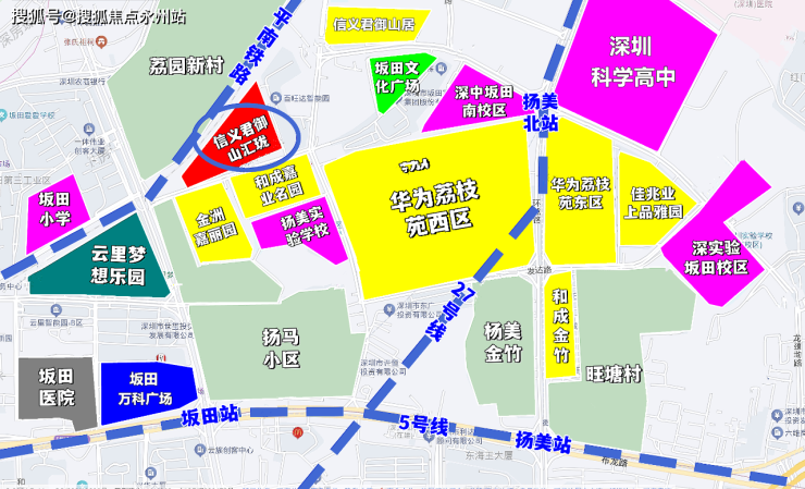 信义君御山汇珑花园,位于龙岗区坂田街道石背路与扬美路交汇处北侧,作为华为全球总部基地所在的坂雪岗科技城,紧挨龙华区,这里可谓是龙岗不可或缺的一部分,在2022年GDP高达2252亿元,占比龙岗全区66%,也一度占据龙岗榜首,该片区重点发展现代通信技术、新型显示、云计算、下一代互联网、高端生产性服务和高标准、高品质城市公共服务等,打造成为国际知名的通讯技术与计算机技术研发和总部为主导的综合性新城区。