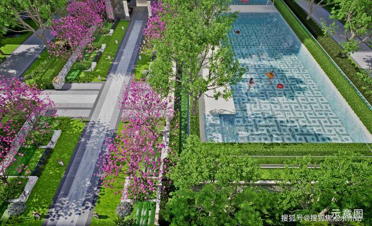 最引人注目的是项目的度假风情式灵动泳池,设计理念是"消弭与天地的界限,天光云影跌入碧波,岸边花树晕开整片画卷的镜花水月",泳池还配备了臭氧消毒系统,确保水质安全卫生。