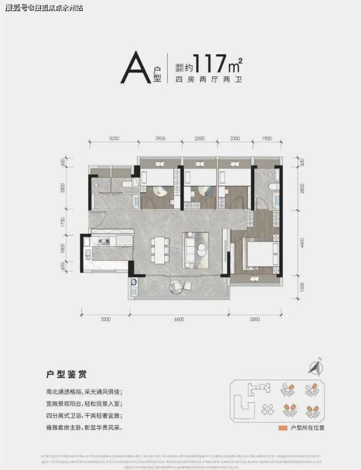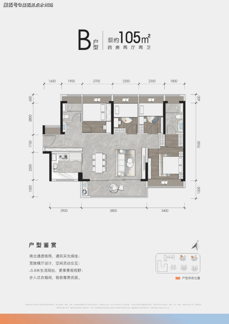 一共有62套:105㎡的南北通透横厅四房两厅两卫,带5.8米超大景观生活两用阳台,全屋采光、透气效果绝佳,主卧还配置了步入式的衣帽间,对于二孩家庭来说,是非常高性价比的一步到位选择。